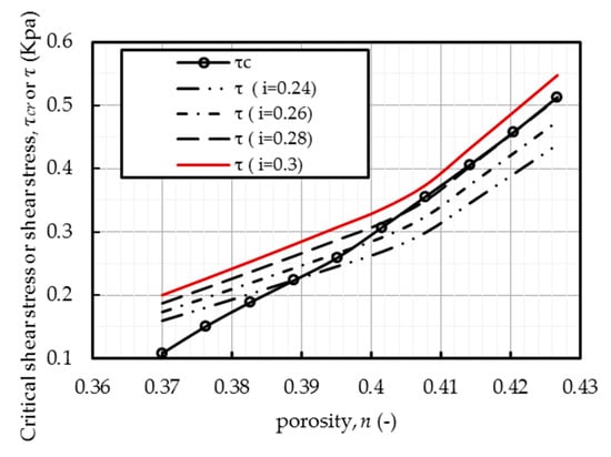 Taking Run A in Skempton and Brogan [] as an example (see Figure 14), under the hydraulic gradient i = 0.28, when n < 0.405, τ > τc, which means suffusion is triggered and developed; when n > 0.405, the τ-n curve almost coincides with the τc-n curve, which means that the suffusion process is irreversible. When i = 0.30, the τ-n curve is always above the τc-n curve and there is no intersection between the two curves. This indicates that under this hydraulic gradient, the suffusion process of the soil is still irreversible.