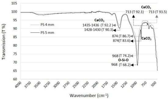 We observed a broad band at 1430 cm−1 and sharp peaks at 874 cm−1 and 713 cm−1 (Figure 1), indicating the presence of calcium carbonates [30,31,32]. Previous results from Kiefer et al. have shown a calcium carbonate spectrum with similar bands and peaks, at 1390 cm−1, 871 cm−1 and 712 cm−1 [32]. Indeed, Fang et al. [30] analyzed a similar calcium silicate with the same band, at 1430 cm−1, which according to the authors indicates the great potential of the material for releasing Ca2+ and OH−. This indicates that the presence of calcium carbonates in the CAAC that we studied might lead to precipitation and crystallization of P with Ca. The PS 5 mm showed slightly lower transmission for all peaks as compared to PS 4 mm, which might indicate a tendency for having higher contents of the compounds described previously.