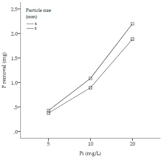 Moreover, a proportional relation between Pi and total P removed was evident. The removal of P provided by Pi20PS5 was approximately four-times that of Pi5PS5. The total P removed by Pi20PS5 was approximately two times that of Pi10PS5. Finally, Pi10PS5 removed twice as much as Pi5PS5. The same relation was identified when PS 4 mm was used. Therefore, for the current experimental conditions, the removal of P is proportionally related to the Pi. In other words, if the Pi increases two or four times, it can be expected that the removal of P also will follow this proportional increment, regardless of PS.