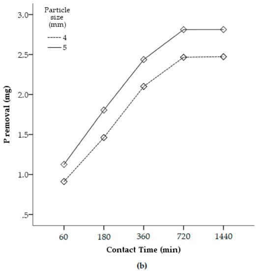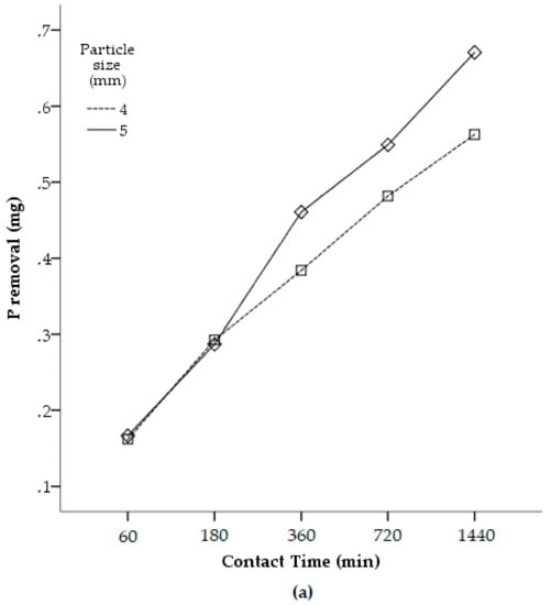 Furthermore, an interaction between PS and CT was observed when Pi was equal to 5 mg L−1 (Table 2), which was probably related to the fact that during the first 3 h, differences between PS were not significant (Figure 3a). However, no significant interactions occurred when Pi varied from 10 to 20 mg L−1, which are the mean differences significant for all CT (Figure 3b). The results presented for the interactions between PS with Pi, were likely related to the differences between levels of PS across levels of Pi, which were generated mainly by the absence of significant differences between PS during the first 3 h (CT: 180 min) when Pi was equal to 5 mg L−1, as previously stated. The interactions between PS × Pi and PS × CT can be explained by an absence of differences of one of three levels (Pi—5 mg L−1) and two of five levels (CT, 60 min and 180 min), respectively. For further studies, we would strongly recommend to increase the number of samples during the first 3 h for Pi equal or lower than 5 mg L−1.