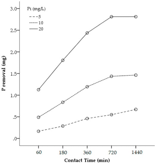 The differences between Pi across the levels of CT were significant, with Pi 5 and 20 mg L−1 responsible for the lowest and highest P removal rates, respectively. The study of Deng and Wheatley [15] also showed a linear increment of P removal as the Pi increased (from 5 to 30 mg L−1). By compared the relationship between P sorption performance of different materials by varying Pi (mg L−1), Cucarella and Renman [20] found an exponential tendency: increasing Pi correlates with a higher sorption of P, as this interaction is stronger with increasing Pi. At higher concentrations of P, besides adsorption, other removal process such as complexation and precipitation took place, resulting in higher P removal rates [15,20].