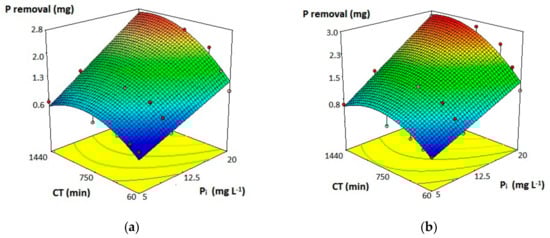 Response surface plot for P removal. (a): PS 4 mm; (b): PS 5 mm. Adapted from Design Expert® software (version 7.0, Statease, Minneapolis, MN, USA).