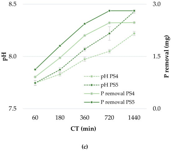Kinetics of P removal (mg) and pH. (a) Pi 5 mg L−1; (b) Pi 10 mg L−1; (c) Pi 20 mg L−1.