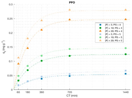 In this regard, the q(CTANOVA)calc values for both models (PFO and PSO) were very close to q(e)exp. Indeed, considering R2 and MPSD, the PSO fitted slightly better the experimental data when compared to PFO, (Table 3 and Figure 7). For all treatments, the correlation coefficient proved to be higher in PSO except for the PS4 Pi10 treatment, for which R2 was 1.3% below the PFO model fit for the same treatment. With similar results, a lower MPSD was obtained for the PSO model except for PS4 Pi10, which presented an increase of (2.6%) with respect to PFO model for the same treatment.