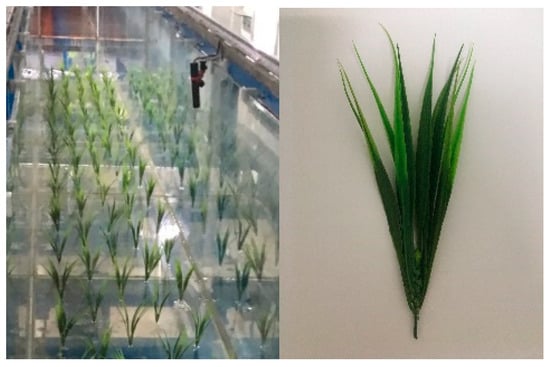 Flexible aquatic plants are simulated using plastic materials, where the plant height is 20 cm; the leaf length is 17 cm; the leaf is arc-shaped, which is narrower at both ends and wider at the middle; the top width is 0.5 mm; the bottom width is 2 mm; and the middle width is about 1 cm (Figure 2).