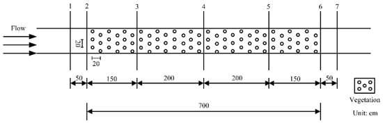 In this experiment, the flow rate was set to 0.06 m3/s and the water level was set to 0.4 m. Aquatic plants were arranged in a staggered pattern over a length of 7 m. There were a total of seven measurement sections with 11 points spaced 3 cm apart in each section (Figure 3). The velocity was measured using an acoustic Doppler velocimeter (ADV; Vectrino, Nortek, Norway) with a frequency of 20 Hz for 120 s. The data for each point were composed of 2400 samples, from which the average velocity was calculated. Note that the velocity 5 cm below the water surface and 5 cm above the flume bottom could not be measured because of the limitation of ADV. In order to ensure high measurement accuracy, glass sand with a diameter of 10 microns was added, and the accelerated threshold method was used to post-process the data []. Submerged aquatic plants often have 4–12 leaves [], and the average number of leaves is 7 in the study of Zhang and Lai []. Therefore, the effects of aquatic plants with no leaves (L0), 4 leaves (L4), 8 leaves (L8), and 12 leaves (L12) on the flow characteristics were investigated in this study.