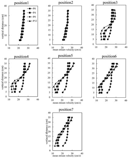 Flow velocity can affect the water-carrying capacity of rivers and the erosion at the bottom of rivers. Considering that the existence of vegetation may change the distribution of flow velocity, the mean streamwise velocity profile under L0, L4, L8, and L12 is shown in Figure 4.