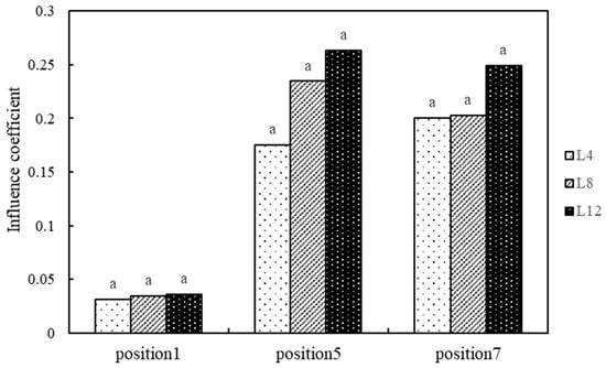 The influence coefficients at position 1, 5, and 7 (note: values within a position followed by the same letter are not significantly different (LSD, p < 0.05)).