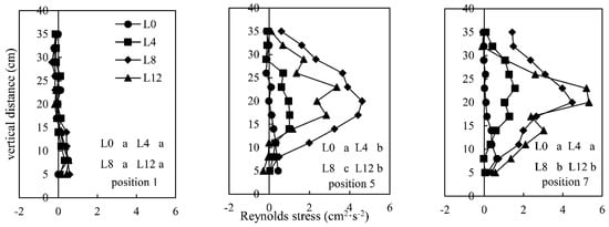 It can be seen from Figure 6 that the Reynold’s stress under L0, L4, L8, and L12 varies only slightly from −0.4 to 0.8 in the vertical direction at position 1 and there is no significant difference between them, indicating that aquatic plants have little effect on the Reynold’s stress upstream the vegetation area. At position 5, the Reynold’s stress in the vertical section changes little under L0; whereas that under L4, L8, and L12 increases until a maximum is reached near the top of the plant, and then decreases along the vertical direction. A similar phenomenon is observed in other studies [,]. There is a great difference in velocity at the top of the plant, resulting in the formation of a large number of vortices, and thus significant changes in the momentum exchange. It is also noted that flow can cause oscillation of aquatic plants, which is more pronounced near the top of the plant and produces more momentum exchange []. In addition, the number of leaves has a significant effect on Reynold’s stress in the vegetation area. With the increase of leaf number, the Reynold’s stress increases first and then decreases, indicating that the presence of a large number of leaves can inhibit momentum exchange in the vegetation area. Wilson et al. [] also found that leaves inhibited momentum exchange. There may be two reasons for this: (1) the increase of leaf area will increase the momentum absorption area []; and (2) the increase of leaf volume will reduce plant oscillation. However, unlike the study of Wilson et al. [], in which a large leaf (7 cm long and 10 cm wide) was used, a slender leaf (17 cm long and 0.05–1 cm wide) was used in this study to more accurately determine the relationship between flow momentum exchange and leaf area and leaf number. At position 7, the maximum Reynold’s stress increases with the increase of the number of leaves, indicating that the number of leaves has a significant effect on the Reynold’s stress downstream the vegetation area.