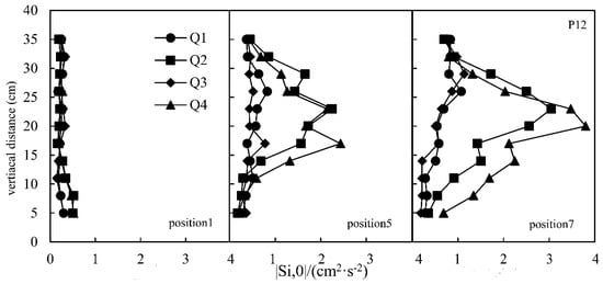 It can be seen from Figure 7 that the Reynold’s stress contribution values under L0, L4, L8, and L12 are similar at position 1. There is no significant difference in the Reynold’s stress contribution values in the upper layer (z > 17 cm), and the ejection and sweep of flow dominate in the lower layer (z < 17 cm). At position 5, the contribution values under L4, L8, and L12 are increased significantly in all four quadrants, especially the values of Q2 and Q4. Thus, aquatic plants increase the momentum exchange in the vegetation area mainly by increasing the ejection and sweep. The contribution values in Q2 and Q4 reach a maximum near the top of the plant and then decrease to both sides, while those in Q1 and Q3 show no significant change. Ejection outweighs sweep in the upper free water layer and the opposite is true in the lower aquatic plant layer, which is similar to other studies []. In the four cases, the highest values are obtained in Q2 and Q4 under L8, indicating that the ejection and sweep are the strongest in the case of L8 in the vegetation area. At position 7, the contribution values in Q2 and Q4 also reach a maximum near the top of the plant and then decrease to both sides, while those in Q1 and Q3 also show no significant change. The values in Q2 and Q4 under L8 and L12 are significantly higher than those under L0, and the largest values of Q2 and Q4 are observed in L12. Thus, the momentum exchange downstream the vegetation area depends mainly on the ejection and sweep, and the higher the number of leaves, the higher the intensity of the ejection and sweep downstream the vegetation area.