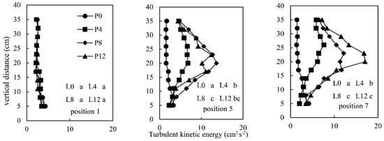 There is no significant difference in the turbulent kinetic energy at position 1, and the turbulent kinetic energy at the bottom is slightly larger than that in the upper layer, which indicates that aquatic plants have little influence on the turbulent kinetic energy upstream the vegetation area. However, there is a significant difference between L0, L4, L8, and L12 in the vegetation area. The turbulent kinetic energy of L0 at position 5 is similar to that at position 1, and it is also slightly higher at the bottom than that in the upper layer. The turbulent kinetic energy of P4, P8, and P12 at position 5 increases gradually in the vertical direction and reaches a maximum near the top of the plant, and then decreases gradually. The turbulent kinetic energy of L8 is the largest, and it increases first and then decreases with the increase of the number of leaves. At position 7, the turbulent kinetic energy increases with the increase of the number of leaves, indicating that the number of leaves has a significant effect on the turbulent kinetic energy downstream the vegetation area.