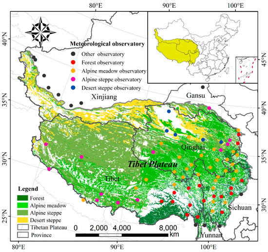 The study area and location of the meteorological stations. The ecosystems covered forest, alpine meadow, alpine steppe, and desert steppe.