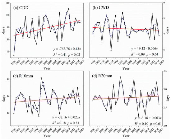 Interannual variation of precipitation days across the Tibetan Plateau from 1986–2015. Graphs represent (a) CDD, (b) CWD, (c) R10mm, and (d) R20mm. The black solid line is the interannual variation, the red solid line is the linear trend, and the blue dotted line is the five-year smoothing average.