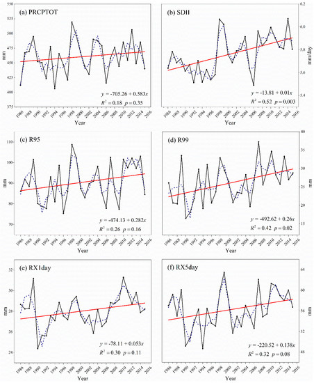 Interannual variation of precipitation across the Tibetan Plateau from 1986–2015. Graphs represent (a) PRCPTOT, (b) SDII, (c) R95, (d) R99, (e) RX1day, and (f) RX5day. The black solid line is interannual variation, the red solid line is the linear trend, and the blue dotted line is the five-year smoothing average.