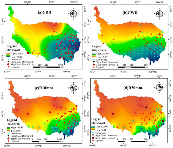 Spatial pattern of values and trends in indices for the number of precipitation days in the Tibetan Plateau from 1986 to 2015 for (a) CDD, (b) CWD, (c) R10mm, and (d) R20mm. The blue triangles represent a downward trend, the black triangles represent a significant downward trend, the red circles represent an upward trend, and the dark red circles represent significant upward trend. A significance level of 0.05 is considered.