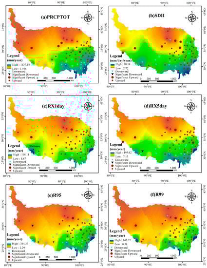 Spatial pattern of values and trends in indices for precipitation in the Tibetan Plateau from 1986 to 2015 for (a) PRCPTOT, (b) SDII, (c) RX1day, (d) RX5day. (e) R95, (f) R99. The blue triangles represent a downward trend, the black triangles represent a significant downward trend, the red circles represent an upward trend, and the dark red circles represent significant upward trend. The significance level of 0.05 was considered.