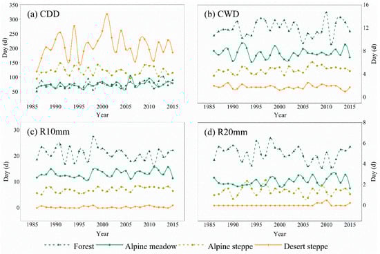 Temporal pattern of precipitation days in different ecosystems of the Tibetan Plateau from 1986 to 2015. Graphs represent (a) annual variation of CDD in different ecosystems, (b) CWD, (c) R10mm, and (d) R20mm.