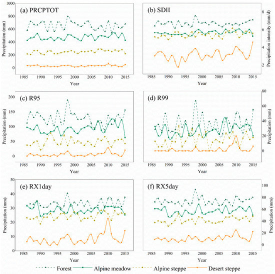 Temporal pattern of precipitation in different ecosystems of the Tibetan Plateau. Graphs represent (a) interannual variation of PRCPTOT, (b) SDII, (c) R95, (d) R99, (e) RX1day, and (f) RX5day.