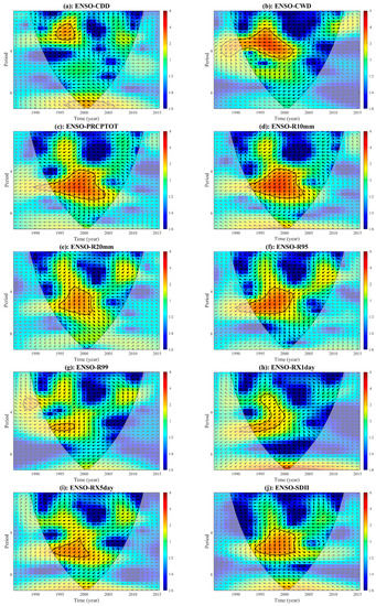 This study analyzed the correlation between extreme precipitation indices and ENSO using the crossover wavelet transform (Figure 8). To synthesize, we selected CWD, R95, SDII, and R20mm, which represented the duration, magnitude, intensity, and frequency of extreme precipitation, respectively. The details for other extreme precipitation indices also are shown in Figure 8.