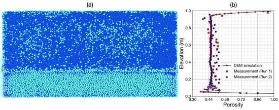 Porosity obtained from DEM simulations in comparison with the porosity measurement of Navaratnam et at. [41] (a) gravel flume, (b) vertical porosity variation.