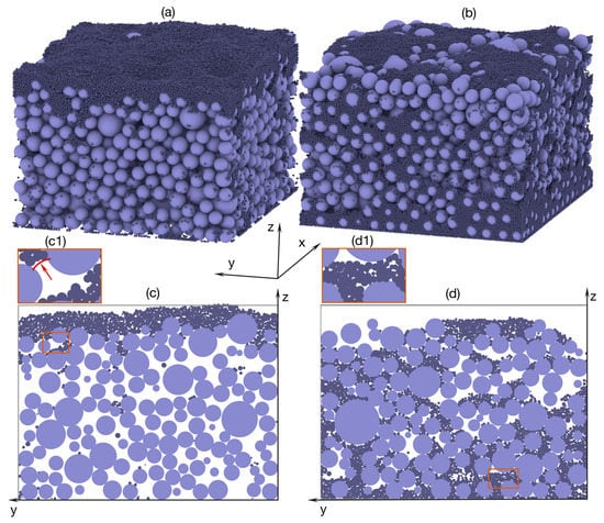 Figure 8 presents the structure of the gravel-bed as well as the distribution of fine sediments for Case-3 and Case-4 at the end of the simulation. Figure 8a shows the 3D structure of the gravel-bed and fine sediment distribution in the bridging case. The infiltration process was stopped when the top gravel layer was filled. Figure 8c shows exemplarily bed materials at the middle x cross-section at the end of the simulation, where the clogging of fine sediment occurs at the surface. The formed fine sediment layer prevented the upper sediment from filling to the sublayer, where almost all void space remained empty. As can be seen in Figure 8(c1), although the diameters of fine particles are significantly smaller than the void space, they connect to build the ‘bridge’ across gravel called ‘cake filtration’, which depends on the size ratio of gravel and the vertical fine sediment rate [43,44,45]. Figure 8b shows the 3D structure of a gravel-bed and fine sediment distribution in the percolation case. The ratio of mean diameter gravel and fine sediment (Dm/dm) in our simulation (52,69) is in the range of percolation (30–70). In this ratio, fine particles are easy to infill to gravel, a fact consistent with what has been found in previous studies [46]. Figure 8d shows the middle x axis cross-section with most of its void space filled by sediment, however, not all void space was entirely filled. In the bottom of the simulation domain (Figure 8(d1)), fine sediment could not move down because of the bottom walls effect, leading to a sudden increase of fine fraction near the flume bed. This phenomenon usually occurred in flume experiments with gravel and fine sediment [10,42,47]. While there are some limitations in the time and scale of the simulations, it can be said that DEM is suitable for simulating the realistic 3D structure of fine sediment and gravel.
