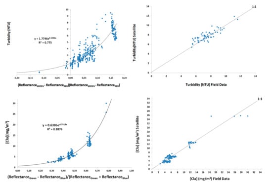 The obtained results correspond to two topics: (i) thematic maps derived from images that represent an interesting approach to the near real-time monitoring of water quality, very valuable from the point of view of inland waters management, and (ii) field data that display the anomalies in the relationships between the [Cla] data and turbidity data, based on which a radiometric water quality field data campaign was planned and the existence of non-algal particulate matter (NAP) was identified.