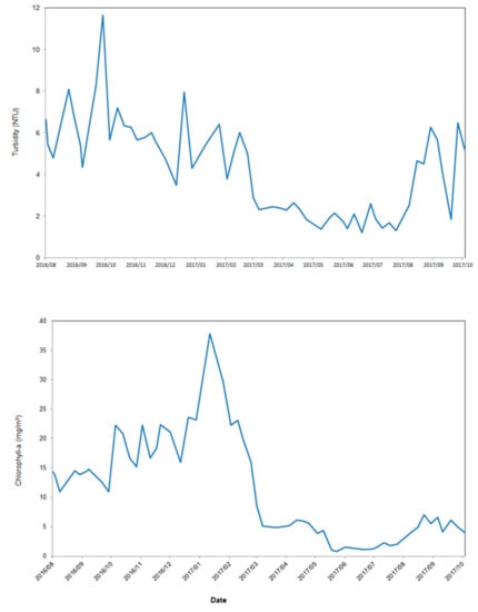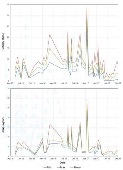 - Turbidity and [Cla] time series from turbidimeter and fluorometer measurements in the first meter of depth are presented in Figure 3. Minimum values (around 2 mg m−3) of chlorophyll-a were frequent during summer 2017, whereas maximum values (up to 37 mg m−3) were recorded in January 2017, when storms resulted in the inflow of nutrients to the Mar Menor. Maximum values of turbidity were recorded in October 2016; minimum values also were recorded in summer 2017.