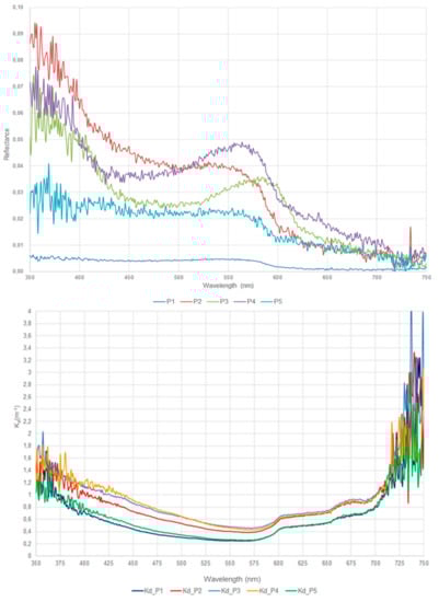 - There are several areas in which natural marine water may be considered (point P1), where the reflectance and diffuse attenuation coefficient values are lowest, and the SD values are highest.