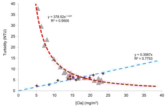 This visual analysis raised the need for a statistical study of the thematic cartography (Figure 6). The dates on which the values of turbidity and [Cla] were maximal coincide. However, the behavior of the minimum values was different, as can be observed in the period from 28 January 2017 to 9 April 2017. The behavior during this period of the maximum, minimum, and mean values differed between turbidity and [Cla]. A clear absence of a relationship between these two parameters made it necessary to analyze the field data; this revealed two types of relationship between turbidity and [Cla] (Figure 7). Based on this result, an extra field data campaign was planned, with the aim of identifying the cause of this situation.