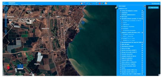 Within the IDEARM project (Design and implementation of spatial data infrastructure (SDI) on agriculture and water in the Region of Murcia), a thematic geoportal is being developed that includes remote sensing data from Campo de Cartagena and the Mar Menor. The geoportal is intended to integrate the altimetry and bathymetric information available from the different producer organizations, the objectives being the compilation of the historical series of altimetry available for the study area and the development of a platform that allows the spatial and temporal monitoring of the Mar Menor. The viewer of the project that is being developed will be able to integrate information from satellite images (Landsat 8, Sentinel II, Spot 7, Pleiades, and Deimos), aerial photographs from different civil and military flights, and photogrammetry and bathymetric data obtained by different national and regional agencies. The geoportal developed within the project IDEARM integrates datasets from various government bodies which have in common a spatial component that allows their localization in the territory. In this sense, the Infrastructure for Spatial Information in the European Community (INSPIRE) directive has been applied as a framework. Furthermore, a spatial data infrastructure based on Open Geospatial Consortium (OGC) services has been built to query and manage useful information, especially for the Mar Menor communities, becoming a support tool in decision-making for environmental monitoring.