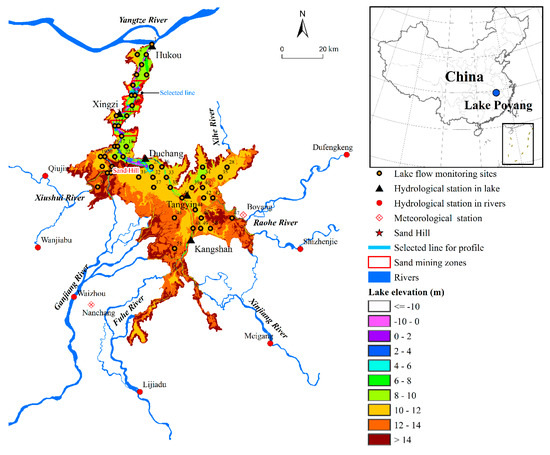 - Lai, X.J.; Shankman, D.; Huber, C.; Yesou, H.; Huang, Q.; Jiang, J.H. Sand mining and increasing Poyang Lake’s discharge ability: A reassessment of causes for lake decline in China. J. Hydrol. 2014, 519, 1698–1706. [Google Scholar] [CrossRef]