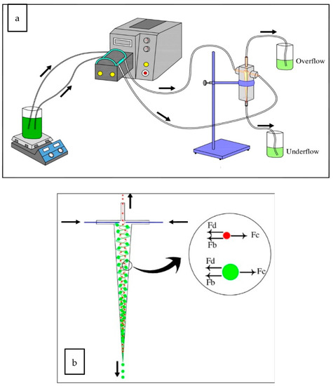To determine if the cells in this work could be easily separated using this technique, initial calculations were completed to validate the experiment. By summing the forces acting on these cells, a net total force can be calculated that will determine if the cells will be present in the underflow or the overflow (Equations (2)–(4)). These forces depend on the diameter of the cell (Dc, m), the density of the cell (ρc, kgm−3) at a specific radial distance (r, m), density of the fluid (ρf, kgm−3), the tangential (νt, m/s) and radical velocity (νr, ms−1) of the cells, and the viscosity of the DI water or Lake Champlain sample (η, kgm−1s−1) [19].