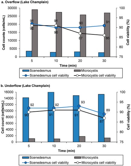 The majority (>86%) of separated cells were viable, which indicates that the separation process did not result in the death of cells (Figure 2). However, for the Microcystis in the overflow sample, the percent viable ranged from 92% to 86% with an average of 89 ± 2.6%. The Scenedesmus cells found in the overflow remained at an average of 91 ± 0.96%, which is viable throughout the experiment. Cells have varying tolerance to shear stress with green algae generally found to be more resistant to cell lysis relative to other phytoplankton [31,32]. A similar trend has been observed with oxidation of cells where green algae have been shown to be more resistant to oxidation relative to cyanobacteria species like Microcystis via ozone, potassium permanganate, and hydrogen peroxide [6,33,34].