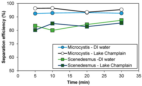 The separation efficiency generated in Lake Champlain water was slightly higher than the DI water for the Microcystis cells, but no difference was observed for the Scenedesmus cells (Figure 3). For Microcystis, this efficiency was an average of 95 ± 1.4% in the Lake Champlain water and 93 ± 0.30% in DI water. In this case, the separation of Scenedesmus cells in the underflow was less efficient at 84 ± 3.1% in the DI water and 83 ± 2.4% in the Lake Champlain water. Over the experiment time period (up to 30 min), no difference was observed with the separation efficiency between the two background matrices highlighting the suitability of the mini-hydrocyclone for potential use in natural waters.