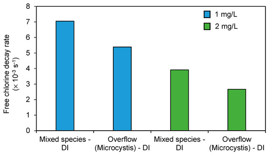 The decay rates generated for Microcystis after separation were significantly higher than those observed for other monocultures. For example, a monoculture of Microcystis aeruginosa cells both in DI water and in a natural water sample ranged from 6.4 to 8.2 × 10−5 s−1 (104 cells/mL and 2 mg/L of free chlorine) [18]. Similarly, Anabaena circinalis (2 mg/L free chlorine and 4.6 × 104 cells/mL) had a lower rate of 4.6 × 10−4 s−1 [38]. The rapid decay rate observed in this work was attributed to potential differences in the pH as well as cell-specific reactivity, e.g., growth phase and membrane thickness [8,18], but this result could also be an indicator that the Scenedesmus cells are the driver for chlorine consumption. Their presence in the overflow altered the consumption of chlorine.