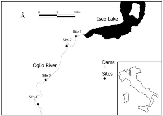 The study was performed at four sites each located downstream of different hydroelectric generation plants (Figure 1). These sites were located in the hydro-ecoregion called “Po Plain” following the Italian government designation (Italian Ministry Decree 260/2010), at an altitude ranging from 181 m (site 1) to 128 m (site 4). The wet riverbed in each site resembles that of the active river channel at the same site with a wide range of discharges due to morphological constraints, e.g., riverbed deepening and the river flowing through a single channel. The width of the riverbed was nearly 30 m at all investigated. The riverbed grain/clast size has been reported according to the Italian standard for biomonitoring, using the intermediate axis length–L [25]. Three sites were composed of coarse-grained materials classified as megalithal (L > 40 cm), macrolithal (20 cm < L < 40 cm) and mesolithal (6 cm < L < 20 cm), while the substrate of the fourth site was mainly mesolithal, microlithal (2 cm < L < 6 cm) and cobble (0.2 cm < L < 2 cm). The percentage of other mineral (e.g., sand, silt) or biotic (e.g., macrophytes, CPOM) substrates were less than 5%, thus limiting the substrate patchiness and its potential effect on macroinvertebrate community composition. Riparian vegetation was present at both side of the riverbed at each site, with the exception of site 1 that had riparian vegetation only on the left side. Considering the width of the active channel, the riparian vegetation cover was less than 10% at each site. The stream slope in the studied reaches was in all case <2.5% and all the sites were located within the first 1.5 km downstream of infrastructure. Agriculture is the main land use in the area and agricultural land represents about 60% of the basin area downstream of Iseo Lake [26] with higher values at the last three studied sites.