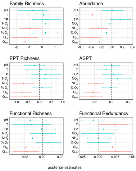 However, based on all the predictors tested (fixed effects), the role of selected hydrological variables on biomonitoring tools can be highlighted. We found partial agreement with our initial hypothesis, the coefficient of variation (Qcv) and the minimum values of discharge (Qmin) were negatively related to all metrics and indices considered, except for FRed that displayed a contrasting pattern.