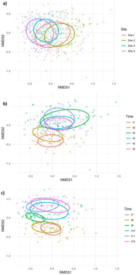Results of non-metric multidimensional scaling (NMDS) ordination: ellipsoid hulls were drawn for sites (a) and the sampling campaigns of 2014 (b) and 2015 (c). A confidence level of 0.5 was adopted for the ellipsoid to increase the readability of the plot and to better assess spatial and temporal trends.