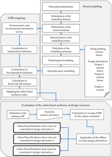 The study was carried out using a computational modelling tool to support hydrological and hydrodynamics simulation scenarios, intending to give basic information about flood consequences over the urban systems. The result of the modelling process characterises the flood events, based on a design storm with a 25-year return period (RP). This RP was adopted due to the official Brazilian government requirements for flood control design. Departing from flood characterisation, and joining the socioeconomic information (obtained from the available census-2010), the UFRI can be built and used in the methodological framework proposed in this work. The detailed steps of this framework are described in the following sections.