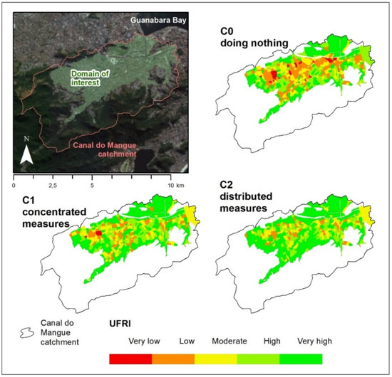 In the present work, a new index, the Urban Flood Resilience Index (UFRI) [50,51], which is an evolution of the work of Bertilsson et al. [52], is used to substitute the FRI in the Adapted Flood Resilience Index (aFResI), in an integrated composition built to compare the resilience behaviour over time, from the current situation to future scenarios. The new adapted method also revises the mathematical formulation of the original proposition. This framework is applied in a highly urbanised watershed in Rio de Janeiro, Brazil, with huge flood problems. Therefore, the future scenario chosen to further stress the current situation considers possible climate change, increasing rainfall intensity and rising mean sea levels (since Rio de Janeiro is a coastal city).