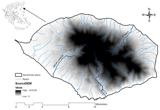 Samothraki is a 178 km2 island in the northeast Aegean archipelago dominated by a high mountain massif in the center, which drains its waters through multiple perennial or intermittent rivers to the surrounding coast (Figure 1). The biggest rivers are the Vatos, Xiropotamos, and Fonias rivers, with historical discharge measurements being available in the last two by the monitoring program of the Public Power Corporation (PPC). Impermeable geological formations of ophiolites and granites predominate [13], with alluvial deposits mostly in a limited area of the western part of the island. The climate is of Mediterranean type, with the historic mean annual temperature and rainfall depth at the closest to the island meteorological station of Alexandroupolis being 15 °C and 552 mm, respectively [14]. However, this station is located opposite the northern part of the island in mainland Greece, and because of its low elevation, the above values need correction in order to be representative for the island [32]. The elevation in Samothraki ranges between 0–1611 m, and its small catchments are generally characterized by very high slope gradients and significant erosion, with the average slope being greater than 30% [14]. The island is characterized by high plant biodiversity, pristine oak, alder, plane and chestnut forests, riparian woodlands, small agricultural areas in the southwestern part, and significant areas of shrublands, pastures, and natural vegetation that are favorable for livestock grazing. Livestock is comprised of small ruminants (goats and sheep), which nowadays have a population of around 45,000 and graze unrestrictedly most of the year [16]. This is the main pressure in Samothraki, since other human pressures such as domestic waste discharge, livestock farming wastes, and diffuse nutrient pollution from crop farming have only very limited and local impacts, primarily at low elevations [13].