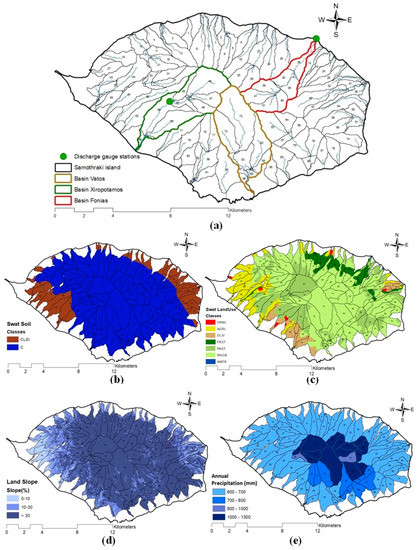 Samothraki island as delineated in Soil Water Assessment Tool (SWAT): (a) subbasins (basins of Xiropotmaos, Fonias, and Vatos are indicated) and discharge stations, (b) soils: silty clay loam (CLSI) and clay (C), (c) land-cover information, (d) slope classes showing the dominating steep slopes (> 30%) in the island, (e) mean annual precipitation. Note: SWAT land-use classes correspond to mixed forest (FRST), pasture (PAST), rangeland (RNGB), agricultural land (AGRL), olive groves (OLIVE), low-density urban land (URML), and water areas (WATR).