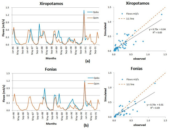 Stream flow evaluation in Samothraki: (a) monthly simulated vs. observed hydrograph at Xiropotamos stream (see Figure 2a) and correlation of flows on a two-axes scattergram, (b) monthly simulated vs. observed hydrograph at Fonias stream (see Figure 2a) and correlation of flows on a two-axes scattergram.
