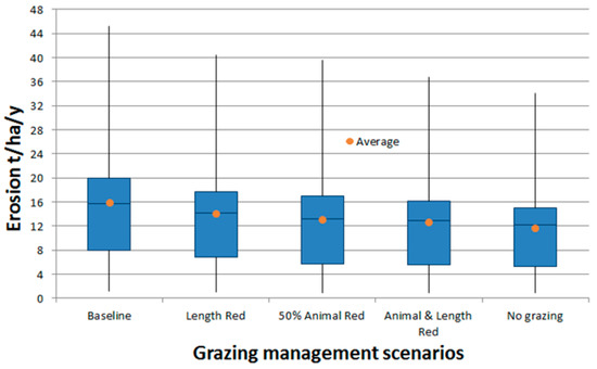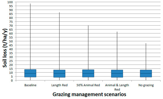 Box plots of annual soil loss in Samothraki Island under various grazing management scenarios from the 21-year period between 1986–2006 simulated.