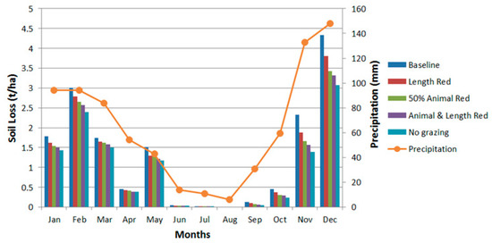 The seasonal variation of Samothraki’s soil loss with and without the implementation of grazing management scenarios is depicted in Figure 5. The bars show the mean monthly soil loss of the entire simulation period under all the scenarios, with monthly precipitation demonstrated in parallel. Similarly to the annual results presented in Figure 4, the monthly variability revealed the same ranking of grazing management options with respect to their effectiveness in reducing soil loss. Their relative performance was stable in all months of the year, with soil loss being consistently pronounced within the year. Soil loss was higher in December and February and significant in January, March, May, and November. This was initially expected due to the Mediterranean precipitation pattern, which caused runoff to vary significantly between the wet and dry seasons. Inevitably, much greater losses of soil occurred during winter months when precipitation depths were the highest within the year, causing flash floods and significant erosion, which was enhanced by the dominant impermeable soils [13]. The greater soil loss in February compared to January is attributed to the more intense events that occured during February, although the mean monthly precipitation depths were very similar. On the other hand, the soil loss difference between April and May is additionally explained by the vegetation characteristics. In May, Samothraki’s land was more susceptible to erosion due to the accumulated grazing of March and April that had reduced vegetation coverage and the natural protection of land against erosion and soil loss. The following dry period of the year (June–September) resulted in almost negligible soil loss due to the very small precipitation and surface runoff generated.