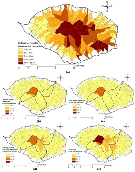 Figure 6b–d and e depict with color differentiation the magnitude of soil loss reduction at the subbasin level from the implementation of the four alternative scenarios. Grazing length reduction (Figure 6b) resulted in a considerable reduction of soil loss only on the headwater subcatchments of the Xiropotamos stream at the mountainous central part of the island. Among them, most had soil loss reductions greater than 20%, and a small one had reductions greater than 10%. The 50% animal reduction scenario added the latter to the higher class of > 20% soil loss reduction (Figure 6c), while the combination of the two practices added three more subbasins in the class of > 10% soil loss reduction (Figure 6d), with the two of them being the headwater subcatchments of the Fonias and Vatos streams, respectively. Non-grazing has resulted in the most effective soil loss reduction in the island by adding a few more subbasins in the second class of soil loss > 10% and by dramatically decreasing the soil loss from the headwater subcatchments of Xiropotamos, moving them to the fourth and most effective class of > 50% soil loss reduction (Figure 6e). It should be noted that under all the scenarios, the majority of Samothraki’s subbasins located at lower elevations remained within the first class of < 10% soil loss reduction. Except for the ones non-dominated by grazed land, erosion in others could be reduced up to 10%, which, based on the standards of this study, was not considered significant enough to alter the local erosion regimes. The soil loss reduction results shown on the maps of Figure 6 depended highly on the level of the actual (baseline) soil loss. The largest reduction levels at the most eroded subbasins was not unexpected, as in those areas, the co-existence of the steepest slopes and the largest grazing land formed the background for the high potential of erosion mitigation when the pressure decreases.