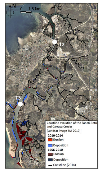 Morphological changes that have affected the CC and SPC networks from 1956 to 2014. Portions in which landscape erosion and deposition have been observed are in different colors. T2 and T3 refer to tidal gauges.
