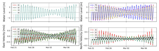 A field survey carried out between February and March (2012) was used to determine the characteristics of the tide in the study site, with two tidal gauges (T2 and T3 in Figure 1) deployed to measure the water level every within the two creeks and four current meters (ADCPs) deployed within the bay (I1–I4 in Figure 1). These data were used to monitor the hydrodynamic field (Figure 3) and provide data for model calibration and testing. The ADCPs collected data for 40 consecutive days with a sampling time of and an average interval of [46]. Tidal elevation data were obtained from the water level time series [69].
