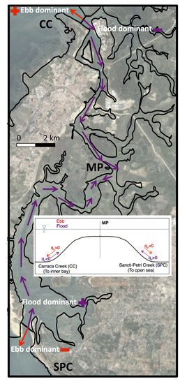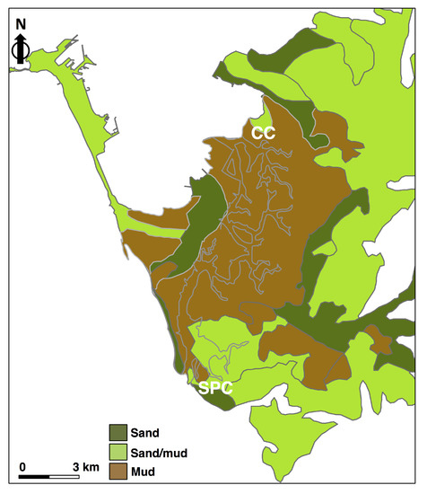 The presence of alternating ebb and flood channels is a general feature of creeks, bays and estuarine systems [87,88]. In particular, at SPC and CC strong tidal currents continually resuspend and rework sediment, specifically during spring tides. Ebb and flood tides can follow mutually evasive channels, and currents may be intense enough to cause scouring at the channel base. Both SPC and CC lack relevant amounts of fluvial sediments and are characterized mainly by the presence of allocutions marine sands and autochthonous mud.
