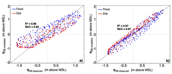 A quite good agreement between observed and simulated water levels was achieved (correlation coefficient ranges between and and skill coefficient [13,82] ranges between and , see Table 3). The regression coefficient for tidal currents was observed to be lower, but the agreement remains quite good (). Model results have been compared with extensive field studies (i.e., [15,83,84]) to verify the accuracy of the hydrodynamic results, being within the same range of values (0.8–0.99). In particular, Figure 5 shows the scatter plots of the computed vs observed water levels at the T2 and T3 stations, which are located within the creek system. In the plots we distinguish between data used for calibration and testing as well as between data referring to the ebb and flood periods. Better agreements were obtained during ebbs than during floods (red points in Figure 5). The differences, which are only relevant in the case of the T2 station, can be ascribed to the complex and dynamically active bed levels in the area, which can be hardly captured with the bathymetric data: despite the high-resolution bathymetry and topography data used, the accuracy in these very shallow areas where the data acquisition is complex and the bed levels vary rapidly is significantly lower. This limitation is more important in T2 that is located in the innermost part of the creek system.